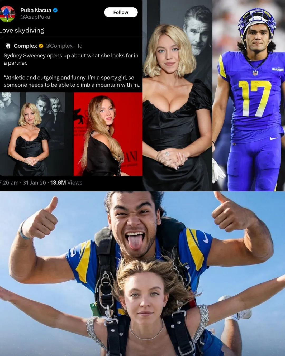 Nacua, 25, is young, incredibly successful, and—following a publicized breakup last year—officially single. He fits every single one of Sweeney’s requirements on paper. He is arguably the most athletic “skydiving enthusiast” in the Los Angeles area.