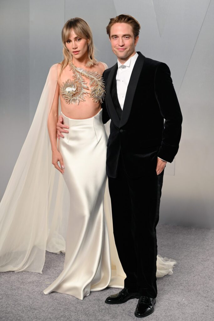 Suki Waterhouse and Robert Pattinson have long since cemented their status as one of Hollywood’s coolest couples, and their style has a big part to play in this. Their appearance on the red (well, grey, actually) carpet at Vanity Fair’s Oscars after-party was a testament to that, with the couple turning up in the sparkliest of looks that conveyed a directional spin on your classic wedding cake bride-and-groom aesthetic.