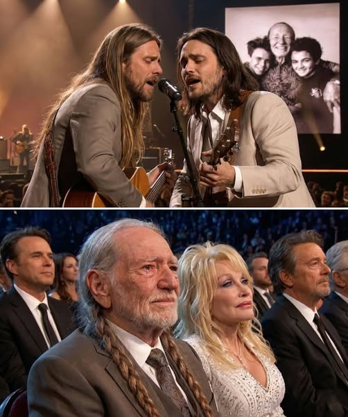 Willie Nelson sat in the front row, surrounded by legends — artists who have spent lifetimes commanding stages of their own. Yet in that moment, all eyes drifted to him. Beneath the familiar brim of his hat, his face softened. From the first harmony, tears came freely. He didn’t try to hide them. He didn’t need to.