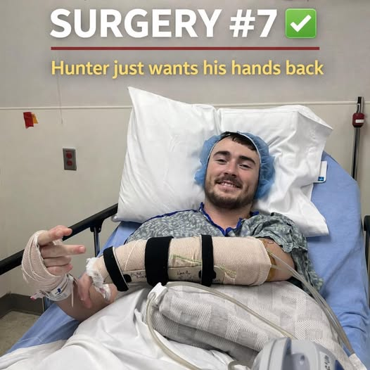This was Hunter early this morning — cap on, arm wrapped, a quiet smile breaking through — just moments before surgery number seven.