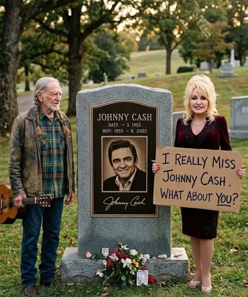 They arrived quietly at Cash’s gravesite, choosing a private moment of reflection rather than a public tribute. As the evening sun drifted low across the Tennessee hills, Dolly gently placed a small bouquet of flowers at the stone. Willie slowly removed his hat and stood beside her, head bowed in silence.