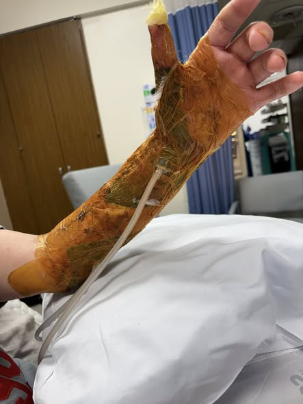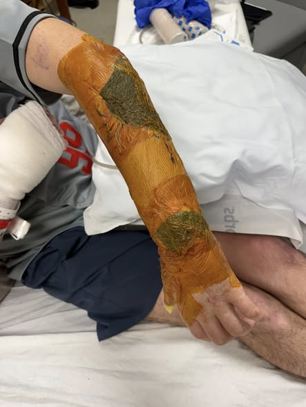 During wound care, doctors removed dead tissue from Hunter’s right hand — and what they found underneath was a powerful sign of progress. A clean, healthy wound bed. Strong granulating tissue. Living tissue doing exactly what it was designed to do: heal.