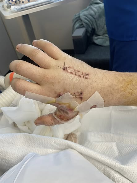 Earlier today, nurses changed the top layers of dressing on Hunter’s right hand after drainage was noted. Because the wound is being treated with Restarta Matrix powder, the inner dressing was carefully left in place — a promising sign in an already fragile recovery.