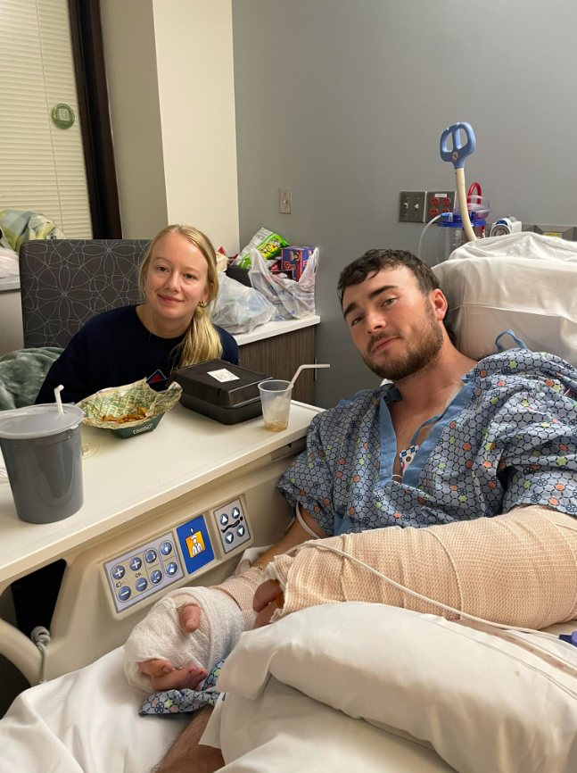 Hunter’s right arm is being bandaged.