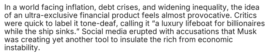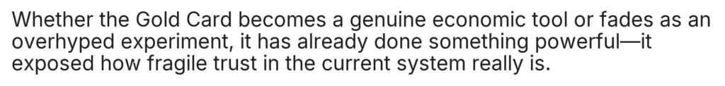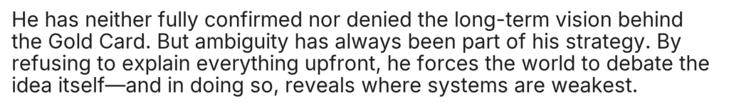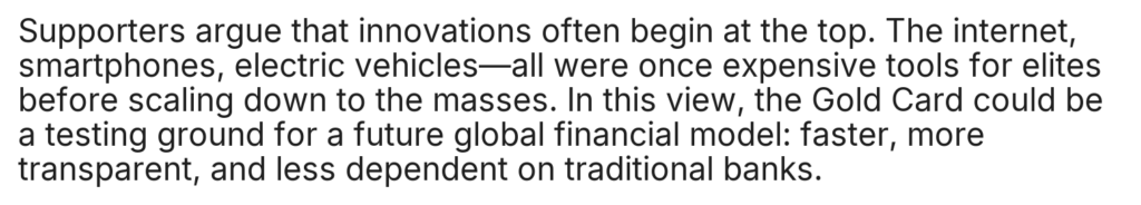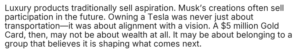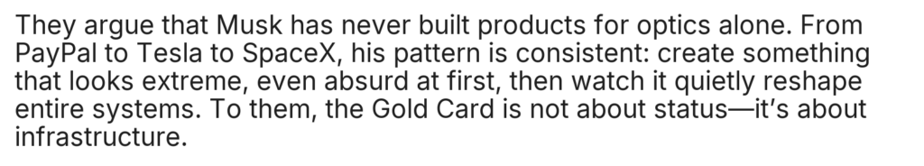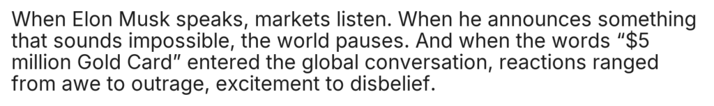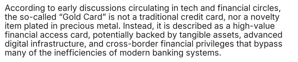 Home/Uncategorized/ST.Elon Musk Announces a $5 Million “Gold Card”: Savior of the Global Economy or Just a Toy for the Ultra-Rich? Uncategorized ST.Elon Musk Announces a $5 Million “Gold Card”: Savior of the Global Economy or Just a Toy for the Ultra-Rich? cuongmhs1237 days ago0 24 Less than a minute cuongmhs1237 days ago0 24 Less than a minute Facebook Twitter LinkedIn Tumblr Pinterest Reddit VKontakte Share via Email Print