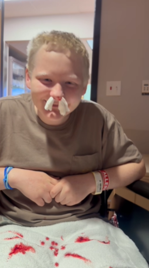The boy sat there, with pieces of cotton temporarily stuffed into his nose to stop the bleeding.