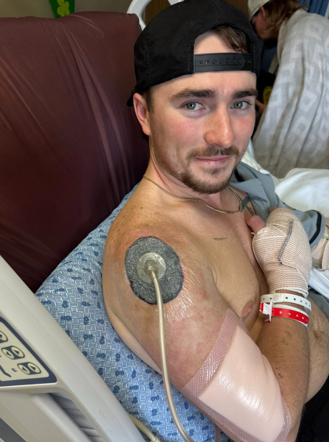 This morning, the family changed Hunter’s bandages again. The wound on his right hand continues to heal with healthy tissue. Doctors also changed the bandages on his right shoulder and continue to monitor his recovery. Although there is still some damaged tissue on his right shoulder that needs further cleaning, his condition has improved significantly. With each passing day, Hunter grows stronger, and his family continues to pray for his complete recovery.