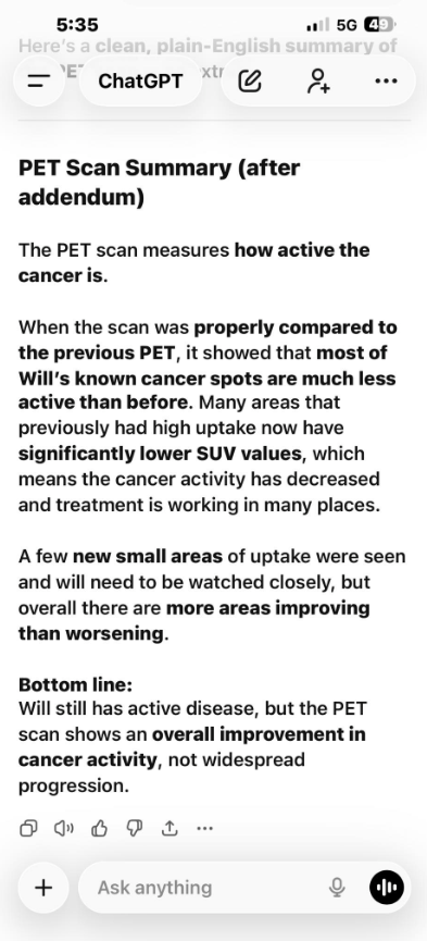 When the PET scan results were compared precisely with Will’s previous scan results, the story changed.